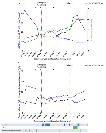 Given the high blood pressure, we regularly tested biomarkers of the angiogenic–antiangiogenic balance (s-flt1 and PlGF) [23]. Even if these markers are not formally validated in CKD patients, they are increasingly employed in monitoring high-risk pregnancies [23,24,25]. In our case, the normal values suggested that placental dysfunction was not playing a major role in sustaining the high levels of proteinuria and hypertension, thus supporting an expectant management, and leading to consideration of dialysis, as discussed below.