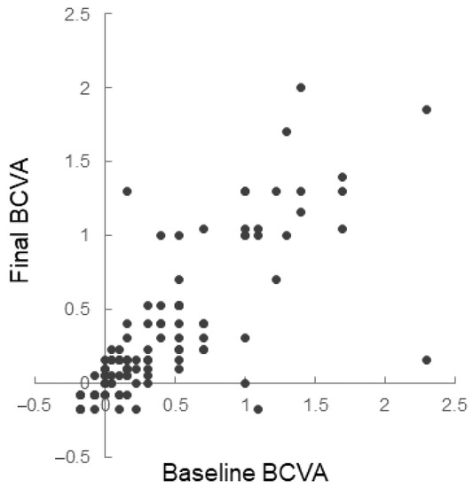 Scatter plots of baseline and final best-corrected visual acuity (BCVA) of the individual eyes. BCVA is expressed after conversion to the logarithm of the minimum angle of resolution.