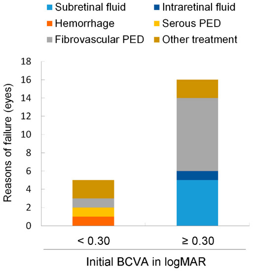 The conditions at the time of failure. Failure of the eyes was determined by a decline of best-correlated visual acuity (BCVA) ≥ 0.2 from the initial BCVA or by the application of treatments other than anti-vascular endothelial growth factor. The numbers of eyes exhibiting fundus findings most likely related to BCVA loss are shown. Two eyes failed owing to other treatment application in both groups, i.e., with or without an initial BCVA < 0.3 in the logarithm of the minimum angle of resolution (logMAR). PED, pigmental epithelium detachment.