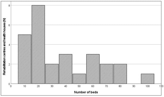 Rehabilitation centres and health houses offered different types of care. Almost all centres and health houses offered inpatient short-term stays (88.9%; 24/27) while about one third of all settings provided inpatient long-term stays (37.0%; 10/27) and day-care (33.3%; 9/27). Home healthcare and outpatient care were less common (respectively, 14.8% (4/27) and 11.1% (3/27)). The total number of beds per clinical setting varied greatly (Figure 1), ranging between 8 and 100 with a median of 29 beds (interquartile range: 17–62). The most frequent diagnostic groups admitted to rehabilitation centres and health houses were stroke (88.9%; 24/27) followed by neurodegenerative diseases (e.g., Parkinson’s disease, multiple sclerosis (85.2%; 23/27)) and traumatic brain injuries (85.2%; 23/27). Over 50% of all centres cared for oncology clients (55.6%; 15/27) and clients with congenital neurological conditions (e.g., cerebral palsy (55.6%; 15/27)) and less than 20% for people with dementia (18.5%; 5/27). Distribution of client numbers per diagnostic group are reported in Table 2.