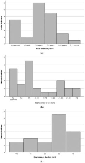 (a) Mean treatment period for clients with eating and swallowing difficulties (nClinicians = 34). (b) Mean number of sessions for clients with eating and swallowing difficulties (nClinicians = 41). (c) Mean sessions duration for clients with eating and swallowing difficulties (nClinicians = 27).