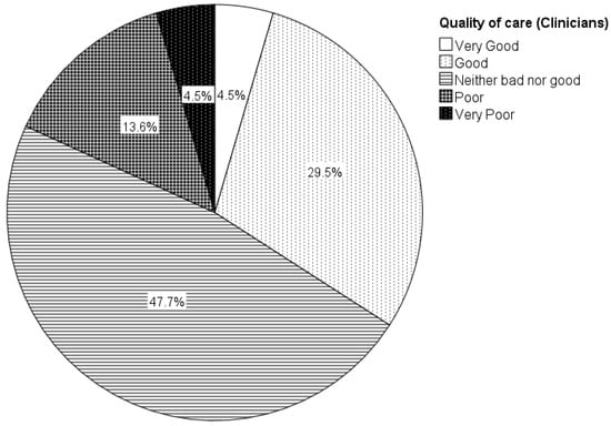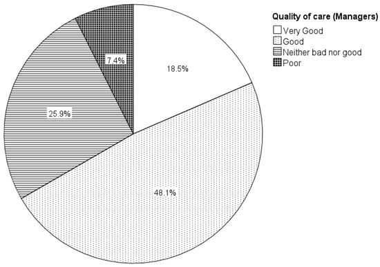 At the end of both surveys, participants were asked how they perceived the quality of care for clients with eating and swallowing difficulties at their rehabilitation centre or health house using a five-point rating scale (incredibly good, good, neither bad nor good, poor, very poor). Almost half of all respondents perceived provided dysphagia care as incredibly good (9.9%; 7/71) or good (36.6%; 26/71). About 40% (39.4%; 28/71) rated care as neither bad nor good. Almost 15%, however, considered care to be either poor (11.3%; 8/71) or very poor (2.8%; 2/71). Group differences between managers and healthcare professionals were statistically significant (Chi-square test: χ2 [2, N = 71] = 7.216, p = 0.027), with managers perceiving quality of dysphagia care at a higher level compared to clinicians (Figure 4 and Figure 5). Group differences between health houses and rehabilitation centres were not significant (Chi-square test: χ2 [2, N = 71] = 2.963, p = 0.095).