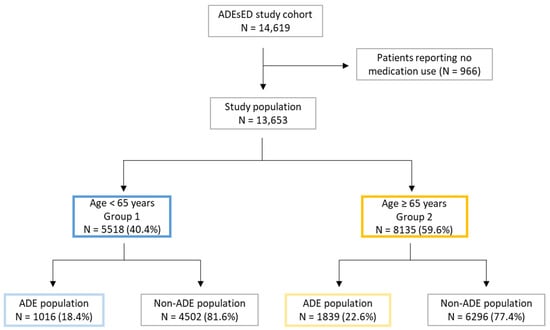 Flowchart of the study population. ADE, adverse drug event; ADEsED: adverse drug events at emergency department (ADEsED); ED, emergency department. ADEsED study is registered on ClinicalTrials.gov (NCT03442010, accessed on 25 August 2022).