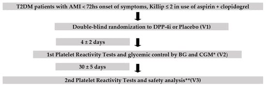 AMI: acute myocardial infarction; ARU: aspirin reaction units; AUC: area under curve; ACS: acute coronary syndrome; BNP:B-type natriuretic peptide; BG: capillary blood glucose; BMI: body mass index; CVD: cardiovascular disease; CGM: Continuous glucose monitoring; DM: diabetes mellitus; DPP4: dipeptidyl-peptidase 4; DPP-4i: DPP4 inhibitor; DAPT: dual antiplatelet therapy; e-GFR: estimated glomerular filtration rate; GLP-1: glucagon-like peptide 1; hs-CRP: high-sensitive C-reactive protein; HF: heart failure; MAGE: mean amplitude of glycemic excursions; PR: platelet reactivity; P2Y12-i: inhibitors of P2Y12 receptor; PCI: percutaneous coronary intervention; STEMI: ST elevation myocardial infarction; T2DM: type 2 diabetes mellitus.