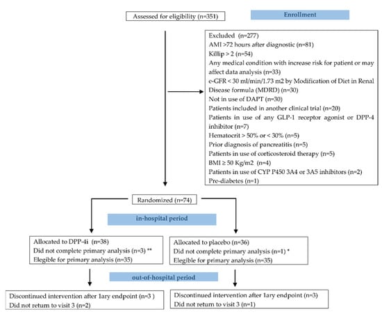 All patients were recruited at the Coronary Care Unit, Heart Institute, University of São Paulo Medical School (InCor/HCFMUSP). Eligible patients were screened for enrollment during their index-hospitalization for AMI. After signing an informed consent form, laboratory tests specified in the objectives described below were collected, as outlined in the study protocol. Patients were randomly assigned to use an DPP-4i or double-blind placebo. Regarding the DPP-4i, initially saxagliptin was used, however during the recruitment period, data from cardiovascular outcome trial with sitagliptin suggested that this drug was safe in relation to heart failure hospitalization [,]. Because of that, in November 2017, an amendment to the protocol was made to change the study drug from saxagliptin to sitagliptin. This change was made after approval by the Institutional Ethics and Rersearch Committee of University of São Paulo (CAPPesq-USP), without unblinding of the data or changes in sample size, primary endpoints or safety endpoints.