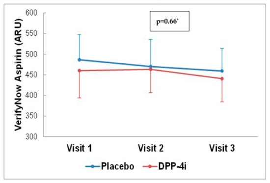 Effects of DPP-4i on Platelet reactivity (Mean ± SD) by VerifyNow Aspirin. Visit 1:baseline Visit 2: 4 ± 2 days. Visit 3: 30 ± 5 days. Visit 1: Placebo (486.45 ± 61.00); DPP-4i (460.13 ± 66.22). Visit 2: Placebo (469.94 ± 65.77); DPP-4i (463.28 ± 56.70). Visit 3: Placebo (459.27 ± 54.50); DPP-4i (440.75 ± 56.20). * ANOVA results expressed as ARU: aspirin reaction units.