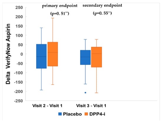 Changes (∆) in Platelet reactivity (IQR) by VerifyNow Aspirin. Visit 1: baseline. Visit 2: 4 ± 2 days. Visit 3: 30 ± 5 days. ∆ Visit 2—Visit 1: Placebo = −14.00 (−77.00; 52.00); DPP4-i= 8.00 (−65.00; 63.00). ∆ Visit 3—Visit 1: Placebo = −16.00 (−56.00; 18.00); DPP4-i = 1.50 (−68.50; 36.50). ** Mann–Whitney test results expressed as ARU: aspirin reaction units.