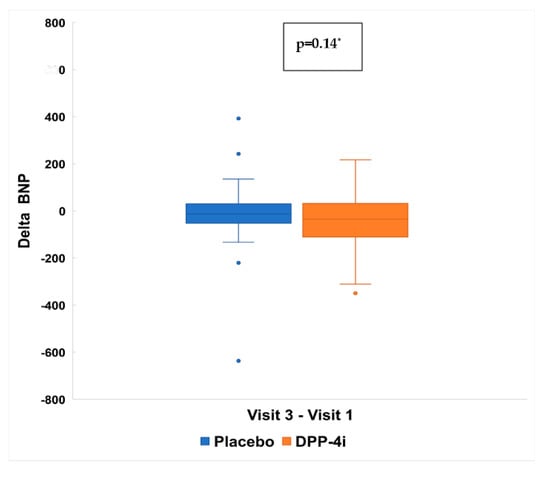 Changes in BNP(∆) between baseline and 30 days. Visit 1:baseline. Visit 3: 30 ± 5 days. ∆ Visit 3—Visit 1: Placebo = −13.00 (−50.00; 27.00); DPP-4i = −36.00 (−110.000; 15.00). * Mann-Whitney test values expressed as pg/mL.
