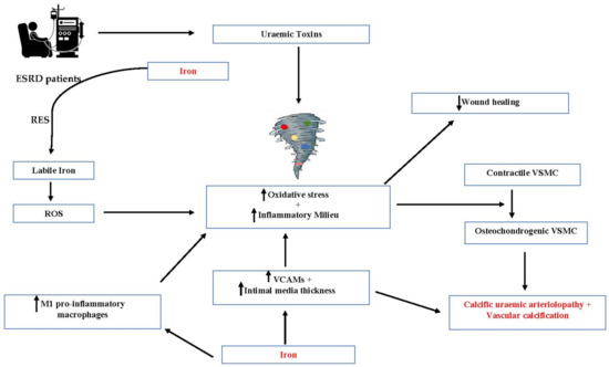 Potential pathophysiological mechanisms of Iron in Calciphylaxis. ESRD—end stage renal disease, RES—reticulo-endothelial system, ROS—reactive oxygen species, VCAMs—vascular cell adhesion molecules, VSMC—vascular smooth muscle cells.