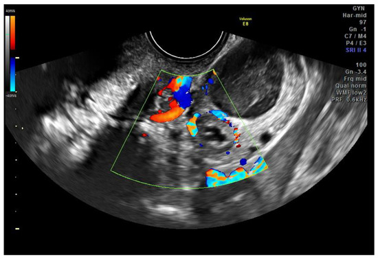 At ultrasound examination, the left adnexal mass on ten women (72%) and the right adnexal mass on 4 (28%) were described with an empty uterine cavity. The endopelvic and abdominal free fluid was detected in 100% of women. A live fetus in two women (14%) was found [,]. In the other cases, a heterogeneous complex adnexal mass with medium/low echogenicity was described [].