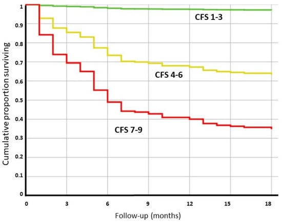 Not unexpectedly, the surviving patients were less frail according to the CFS, and the crude overall mortality was 3.8% in CFS group 1–3, 30.4% in CFS group 4–6, and 73.4% in the frailest group (CFS 7–9). Interestingly, the mortality for each CFS group was significantly different even, after adjustments for age, expected survival, sex, comorbidities, and relevant clinical factors during the hospitalization (Table 1, Figure 1).