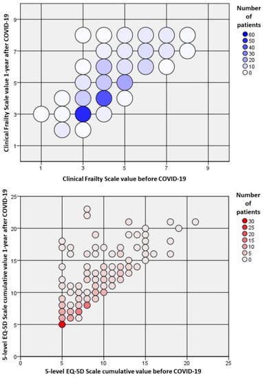Relative changes in frailty and quality of life of survivors one year after the index hospitalization for COVID-19. Frailty was measured according to the clinical frailty scale (CFS), and the quality of life was assessed by the cumulative value of the five-level EQ-5D (EQ-5D-5L). Most of the patients had a worsening in frailty and the measured quality of life.