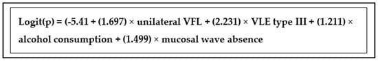 The proposed logistic regression model, which includes evaluation of the patient in terms of VLE, history of alcohol consumption, mucosal wave presence, and VFL localization (uni- or bilaterality), improves the clinical utility of VLE morphological classification and shows improved diagnostic performance. The AUC of this model is higher (0.861). This model shows a lower sensitivity (80.9% vs. 95.7%) and NPV (86.2% vs. 93.9%), but the specificity and PPV are improved (73.7% vs. 40.8% and 65.5% vs. 50.0%, respectively).