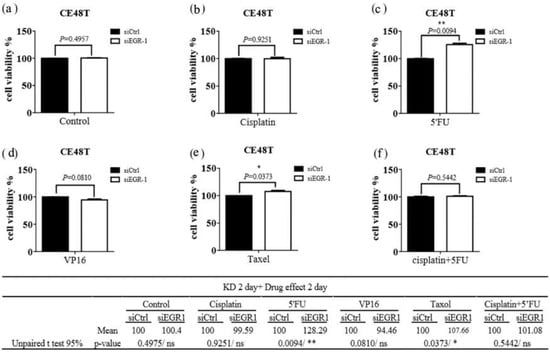 The functional change in drug resistance in ESCC cells after EGR-1 gene knockdown was also assessed. The cell viability assays were applied for evaluation using siEGR-1 groups compared with the siControl group after chemotherapy, including cisplatin [15], 5-FU [16], and etoposide (VP16) [17], taxol [18], and cisplatin with 5-FU [19]. Knockdown of EGR-1 significantly increased the resistance of cisplatin or/and taxol in CE81T cells (Figure 2); the concentration of these anticancer drugs used in cells was referenced from the following literature [15,16,17,18,19,20,21], while silencing EGR-1 significantly increased resistance of 5′FU and taxol in CE48T cells (Figure 3). Therefore, EGR-1 presented the function of tumor viability suppression and reflected better treatment effects of current chemotherapy for ESCC (Figure 2 and Figure 3). In addition, the expected outcome of the siControl group compared with the siEGR-1 group was noted.