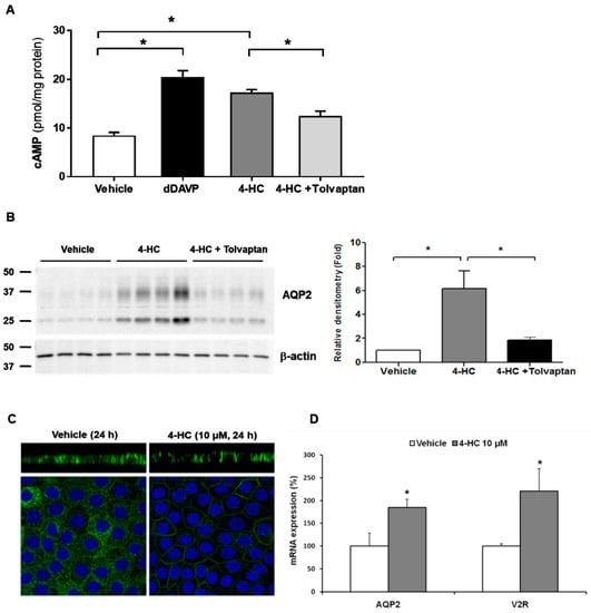 In vitro action of 4-hydroperoxycyclophosphamide (4-HC) for aquaporin-2 (AQP2) upregulation in inner medullary collecting duct (IMCD) cells. The effect of 4-HC, the active hepatic metabolite of cyclophosphamide, was tested in IMCD suspensions and primary cultured IMCD cells. (A) Intracellular cAMP levels were measured by ELISA in IMCD suspensions after treatment with vehicle, 10 nM dDAVP, 10 µM 4-HC, and 10 µM 4-HC + 100 nM tolvaptan at 37 °C for 30 min. (B) Immunoblot analysis of AQP2 was performed from primary cultured IMCD cells treated with 4-HC with and without tolvaptan. (C) Immunofluorescence microscopy for AQP2 in primary cultured IMCD cells shows that AQP2 targeting was induced to the plasma membrane (apical and lateral membrane) by 4-HC treatment (X-Z images). (D) Quantitative polymerase chain reaction data show that AQP2 and vasopressin-2 receptor (V2R) mRNA expression were increased by 4-HC treatment. Each bar represents mean ± SD. * p < 0.05 vs. control by the Mann–Whitney U-test. Adapted from Ref. [32] with permission.