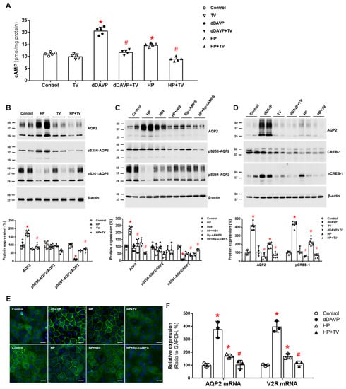 In vitro action of haloperidolforaquaporin-2 (AQP2) upregulation in inner medullary collecting duct (IMCD) cells. (A) cAMP production was measured by ELISA in IMCD suspensions after treatment with vehicle (control), 100 nM tolvaptan (TV), 10 nM 1-desamino-8-D-arginine vasopressin (dDAVP), and 5 μM haloperidol (HP) at 37 °C for 30 min. (B) Immunoblot analyses of total AQP2, pSer256-AQP2, and pSer261-AQP2 in primary cultured IMCD cells treated with 5 μM HP with and without 100 nM TV for 30 min. (C) Immunoblot analyses of total AQP2, pSer256-AQP2, and pSer261-AQP2 in primary cultured IMCD cells treated with 5 μM HP with and without a PKA inhibitor H89 or Rp-cAMPS. (D) Immunoblot analyses of total AQP2, total CREB, and pCREB-1 in primary cultured IMCD cells treated with 10 nM dDAVP and 5 μM haloperidol (HP) with and without 100 nM TV. (E) Immunofluorescence microscopy for AQP2 in primary cultured IMCD cells shows that AQP2 trafficking was induced by dDAVP and haloperidol (HP) but attenuated by coadministration of TV or a PKA inhibitor. (F) Quantitative polymerase chain reaction data show that AQP2 and vasopressin-2 receptor (V2R) mRNA expression were increased by dDAVP and HP but reversed by TV cotreatment. Each bar represents mean ± SD. * p < 0.05 vs. control; # p < 0.05 vs. HP alone by the Mann–Whitney U-test. Adapted from Ref. [38] with permission.