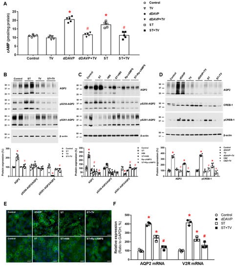In vitro action of sertraline foraquaporin-2 (AQP2) upregulation in inner medullary collecting duct (IMCD) cells. (A) cAMP production was measured by ELISA in IMCD suspensions after treatment with vehicle (control), 100 nM tolvaptan (TV), 10 nM 1-desamino-8-D-arginine vasopressin (dDAVP), and 1 μM sertraline (ST) at 37 °C for 30 min. (B) Immunoblot analyses of total AQP2, pSer256-AQP2, and pSer261-AQP2 were performed from primary cultured IMCD cells treated with 1 μM ST with and without 100 nM tolvaptan (TV) for 30 min. (C) Immunoblot analyses of total AQP2, pSer256-AQP2, and pSer261-AQP2 were performed from primary cultured IMCD cells treated with 1 μM ST with and without a PKA inhibitor H89 or Rp-cAMPS. (D) Immunoblot analyses of total AQP2, total CREB, and pCREB-1 in primary cultured IMCD cells treated with 10 nM dDAVP and 1 μM ST with and without 100 nM tolvaptan (TV). (E) Immunofluorescence microscopy for AQP2 in primary cultured IMCD cells shows that AQP2 trafficking was induced by dDAVP and ST but attenuated by coadministration of tolvaptan (TV) or a PKA inhibitor. (F) Quantitative polymerase chain reaction data show that AQP2 and vasopressin-2 receptor (V2R) mRNA expression were increased by dDAVP and sertraline (ST) but reversed by tolvaptan (TV) cotreatment. Each bar represents mean ± SD. * p < 0.05 vs. control; # p < 0.05 vs. ST alone by the Mann–Whitney U-test. Adapted from Ref. [38] with permission.