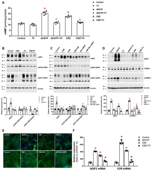 In vitro action of carbamazepine foraquaporin-2 (AQP2) upregulation in inner medullary collecting duct (IMCD) cells. (A) cAMP production was measured by ELISA in IMCD suspensions after treatment with vehicle (control), 100 nM tolvaptan (TV), 10 nM 1-desamino-8-D-arginine vasopressin (dDAVP), or 100 μM carbamazepine (CBZ) at 37 °C for 30 min. (B) Immunoblot analyses of total AQP2, pSer256-AQP2, and pSer261-AQP2 in primary cultured IMCD cells treated with 100 μM CBZ with and without 100 nM tolvaptan (TV) for 30 min. (C) Immunoblot analyses of total AQP2, pSer256-AQP2, and pSer261-AQP2 in primary cultured IMCD cells treated with 100 μM CBZ with and without a PKA inhibitor H89 or Rp-cAMPS. (D) Immunoblot analyses of total AQP2, total CREB, and pCREB-1 in primary cultured IMCD cells treated with 10 nM dDAVP and 100 μM CBZ with and without 100 nM TV. (E) Immunofluorescence microscopy for AQP2 in primary cultured IMCD cells shows that AQP2 trafficking was induced by dDAVP and CBZ but attenuated by coadministration of TV or a PKA inhibitor. (F) Quantitative polymerase chain reaction data show that AQP2 and vasopressin-2 receptor (V2R) mRNA expression were increased by dDAVP and CBZ but reversed by TV cotreatment. Each bar represents mean ± SD. * p < 0.05 vs. control; # p < 0.05 vs. CBZ alone by the Mann–Whitney U-test. Adapted from Ref. [38] with permission.