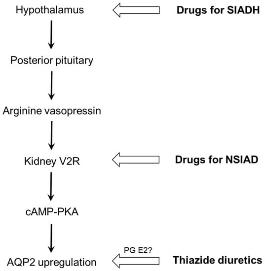 - Frenkel, N.J.; Vogt, L.; De Rooij, S.E.; Trimpert, C.; Levi, M.M.; Deen, P.M.; van den Born, B.J. Thiazide-induced hyponatraemia is associated with increased water intake and impaired urea-mediated water excretion at low plasma antidiuretic hormone and urine aquaporin-2. J. Hypertens. 2015, 33, 627–633. [Google Scholar] [CrossRef] [PubMed]