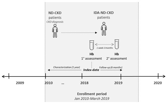 Schematic representation of the study design. Non-dialysis (ND) patients with a diagnosis of chronic kidney disease (CKD) (ND-CKD) were identified during the enrolment period; those presenting two low Hb measurements (with an interval between 1 week and 3 months) were defined as iron-deficiency anaemia (IDA)-ND-CKD.