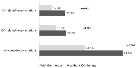 A detailed investigation into hospitalizations showed that IDA-treated versus untreated patients had a significantly (p < 0.001) lower incidence of all cause-related (44.5% vs. 81.8%), cardiovascular-related (12.3% vs. 25.3%), and IDA-related hospitalizations (16.2% vs. 26.2%) (Figure 3).
