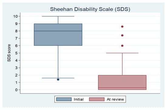 Figure 1. Box plots of severity of dependence scale (SDS) at start of treatment and at time of review. The central mark of the box shows the median value of the scores and the lower and upper top edges of the box indicate the 25th and 75th percentiles, respectively. Outliers are designated with a dot. The whiskers show the most extreme data points not considered outliers.