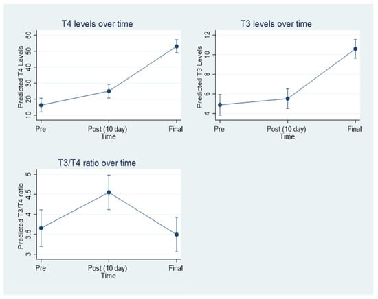 Figure 2. Shows the marginal means of T3 and T4 levels and T4/T3 ratio of the multilevel modelling analyses for pre, post, and final observation times.