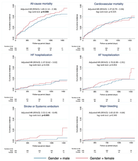 Regarding CV mortality (aHR 1.27; 95% CI 0.79–2.06; p = 0.325), AF hospitalization (aHR 1.7; 95% CI 0.99–2.91; p = 0.053), HF hospitalization (aHR 1.37; 95% CI 0.62–3.02), and major bleeding (aHR 1.65; 95% CI 0.59–4.64), they did not demonstrate any significant differences between groups (Figure 1 and Figure 2). Female gender was associated with stroke or systematic embolic events (aHR 3.52; 95% CI 1.46–8.49; p = 0.005), with an annual rate of 1.1% for men vs. 4.2% for women.