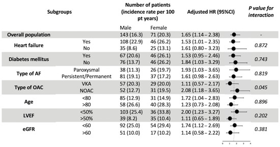 Subgroup analyses for all-cause death did not demonstrate any statistical significance between subgroups of HF, DM, AF pattern, age, LVEF, or renal function (Figure 3). However, the female gender appeared to carry significantly more prognostic value for all-cause mortality in NOAC users compared with VKA users (aHR 2.08 vs. 1.11; p for interaction = 0.045).