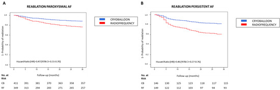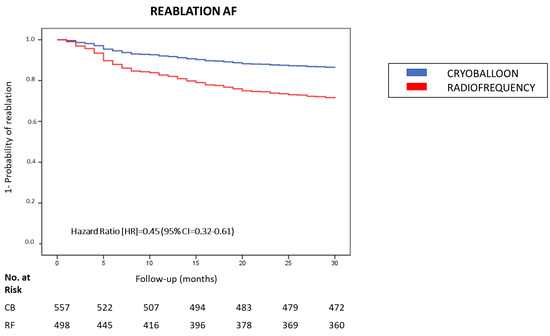 The primary endpoint was the need for a repeat ablation (i.e., reablation) during a 30-month follow-up period after the index ablation procedure with CB or RF technique. Patients selected for reablation were those who presented with recurrence of AF, flutter or atrial tachycardia lasting more than 30 s after 90 days of the index procedure (i.e., blanking period), symptomatic (European Heart Rhythm Association symptom classification (EHRA score) ≥II) and refractory to anti-arrhythmic medication (regimen at the discretion of the cardiologist). The reablation was a final choice in accordance with the patient’s preference. This primary endpoint for reablation was also analyzed for both paroxysmal and persistent AF subsets of patients in the index ablation procedure.