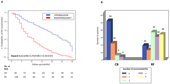The purpose of our study was to compare patients who underwent CB and RF ablation procedures for AF during a 30-month follow-up using demographics, cardiovascular risk factors and clinical variables. Different Cox regression models were used to assess the need for repeat ablation because of arrhythmia recurrence during the follow-up in both groups of patients, as the primary endpoint. The independent variables in these multivariable models were explored as potential predictor variables of reablation. Finally, the PV reconnection was examined as the main arrhythmogenic mechanism involved in recurrence.