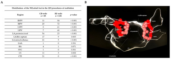 Exact distribution in the PVs of the 502 atrial foci from the redo subgroups observed in the 223 procedures of reablation. (A) Anatomical distribution in the LA and PVs of the atrial foci causing the arrhythmia recurrence in patients from the CB-redo and RF-redo subgroups. (B) Three-dimensional diagram of the anatomy of the LA and PVs. Abbreviations: CB = cryoballoon; CS = coronary sinus; CTI = cavotricuspid isthmus; LA = left atrium; LAA = left atrial appendage; LIPV = left inferior pulmonary vein; LSPV = left superior pulmonary vein; PA = posterior-anterior; PV = pulmonary vein; RIPV = right inferior pulmonary vein; RSPV = right superior pulmonary vein; RA = right atrium; RF = radiofrequency; SVC = superior vena cava.