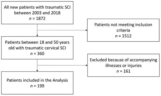 The inclusion criteria for this study were as follows: Participants between the ages of 18 and 50 who suffered from traumatic cervical spine injuries with additional cervical spinal cord damage. Patients were treated with a vertebral fusion of at least one cervical segment and began their rehabilitation at the Spinal-Cord-Injury center in the Berufsgenossenschaftliches Klinikum Hamburg during the period of 2003 to the end of 2018. We limited the age to 50 years to combat the confounding factors that are mainly influenced by age-related functionality reductions and reduce rehabilitation success. Fifty years was an established cutoff in previous publications regarding rehabilitation success in individuals with spinal cord injuries [17,18,19]. A total of 360 individuals could be identified to fit these criteria. Individuals with significant additional illnesses or injuries impairing their functionality, as well as persons with consuming illnesses, were excluded from the analysis. This includes, but is not limited to, individuals suffering from cancerous lesions of the neurological, skeletal, or muscular system, degenerative diseases including spinal stenosis, individuals suffering from severe hemorrhages to the brain or brainstem, as well as individuals suffering from apoplectic strokes. Persons with amputations or severe irreparable lesions of the peripheral nervous system, such as plexus injuries, were also excluded. The enrollment is also presented in Figure 1.