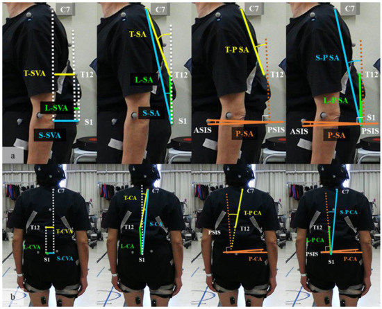 (a) Sagittal parameters: the dotted white line indicates a perpendicular line to the floor. The dotted brown line indicates the perpendicular line to the surface created from the two ASIS and two PSIS points (pelvic surface). SVA was defined by the sagittal distance between C7–T12 (T–SVA), T12–S1 (L–SVA), and C7–S1(S–SVA). SA was defined by the sagittal angle of C7–T12 line (T-SA), T12–S1 line (L-SA), and C7–S1 line (S-SA) from the perpendicular line. PSA was defined by the sagittal angle between the floor and the pelvic surface. T-PSA, L-PSA, and S-PSA were defined by the sagittal angle of C7–T12 line (T-P SA), T12–S1 line (L-P SA), and C7–S1 line (S-P SA) from the perpendicular line to the pelvic surface; (b) coronal parameters: the dotted white line indicates a perpendicular line to the floor. The dotted brown line indicates the perpendicular line to the surface created from the two ASIS and two PSIS points (pelvic surface). CVA was defined by the coronal distance between C7–T12 (T-CVA), T12–S1 (L-CVA), and C7–S1 (S-CVA). CA was defined by the coronal angle of C7–T12 line (T-CA), T12–S1 line (L-CA), and C7–S1 line (S-CA) from the perpendicular line. PCA was defined by the coronal angle between the floor and the pelvic surface. T-P CA, L-P CA, and S-P CA were defined by the sagittal angle of C7–T12 line (T-P SA), T12–S1 line (L-P SA), and C7–S1 line (S-P SA) from the perpendicular line to the pelvic surface. (T), thoracic; (L), lumbar; (S), whole spinal; SVA, sagittal vertical axis; SA, sagittal angle; P SA, pelvic sagittal angle; ASIS, anterior superior iliac spine; PSIS, posterior superior iliac spine.