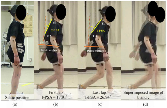 Gait analysis of representative case. This figure shows the posture during gait analysis. Before starting to walk, the patient seemed relatively balanced in an upright standing position before the gait analysis (a). When starting the walk, the thoracic region began to lean forward in the first lap (b). In the final lap, soon before quitting the trial, the tilt of the thoracic spine leaned further forward (c). A superimposed image of the posture during gait showed a change in the thoracic spine tilt between the first (T-P SA 17.91°) and the final lap (T-P SA 26.94°) (d).