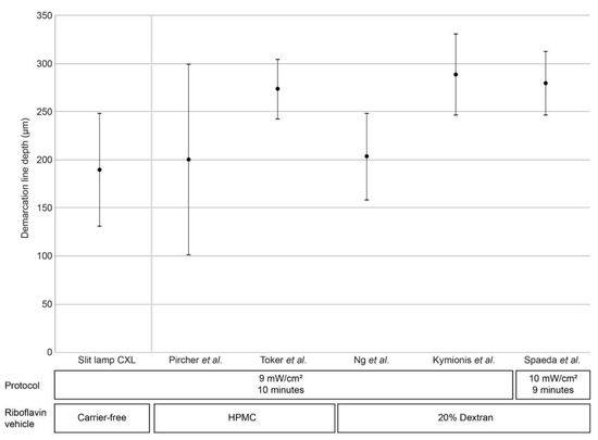 One factor that does affect demarcation line depth is the vehicle used in riboflavin solutions. In general, hydroxypropyl methylcellulose (HPMC)-based riboflavin solutions result in deeper riboflavin penetration and demarcation line depth as compared to dextran solutions [16]. It is worth noting, however, that HPMC-based riboflavin solutions display greater variability in demarcation line depth when used with a 9 mW/cm²/10 min irradiation protocol, such as that reported by Pircher et al. (200 ± 99.76 µm) [10], when compared with dextran-based riboflavin solutions that display considerably lower variability in demarcation line depth (e.g., 203 ± 45 µm and 209 ± 50 µm found by Ng and colleagues [9]; 288 ± 42 µm by Kymionis and colleagues [12], and 265 ± 40 µm by Thorsrud et al. [16].