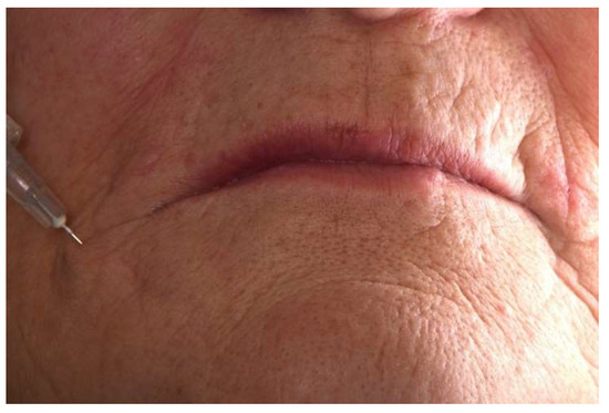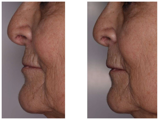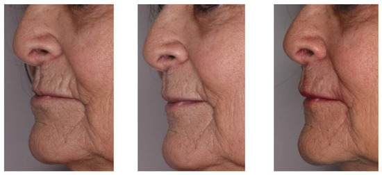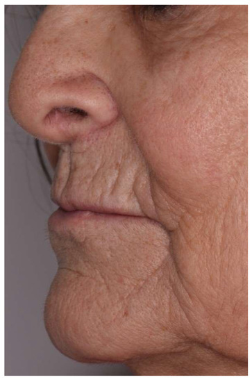 Among these, the orbicularis oris muscle encircles the mouth, inside the lips. A lack of support induces mouth orbicular muscle atrophy, then loss of volume and lips eversion. As a consequence, the visible part of the vermilion shrinks, and the lips invaginate inside the oral cavity, accentuating fine lines and wrinkles on and around the lips. Lowering muscles at the mouth angle (depressor anguli oris) and depressant muscles of the lower lip (depressor labii inferioris) accentuates the labiomandibular folds. The nasolabial angle increases, and the labiomental crease is more pronounced (Figure 2) [8,20,21,22].