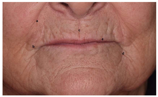 “Scope of action” of the dental practitioner. The lower third of the face: (a) nasolabial fold, (b) labial commissure, (c) philtrum, (d) bitterness fold, and (e) vermilion zone.