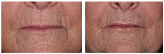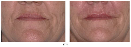 Lips are often very thin in completely edentulous people, despite wearing prostheses. In such situation, HA fillers are of prime interest for volumizing effects that can last for 6 to 18 months, depending on the source, the extent of the cross-linking and concentration of injected product [12,36]. It is particularly indicated for restoring the natural curves of lips and redefining the vermilion contour (Figure 7A,B).