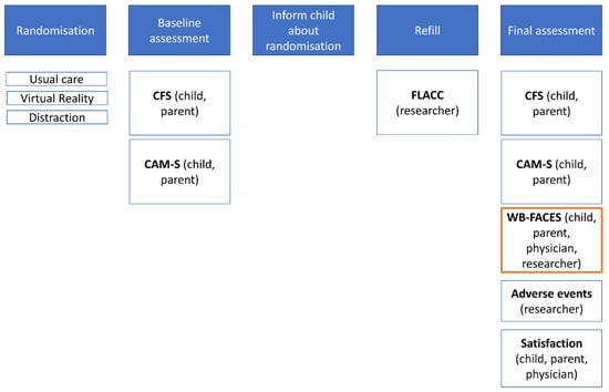 The primary outcome measurement consisted of an evaluation of the pain through the Wong–Baker Faces (WB-FACES) Scale. Pain scores were assessed using self-reports (child), parent’s reports, the reports of the physician who performed the refill procedure and the external researcher. The WB-FACES is consistent with the numeric rating scale of 0 to 10. Six faces on the scale show a range of emotions from smiling (0 = very happy/no pain) to crying (10 = hurts worst). This scale was previously used as a primary outcome measure to evaluate the effect of VR in children [].