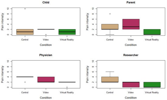 Two of the children indicated a similar pain intensity score for all three conditions. One child indicated a score of 0 for the control condition and a score of 2 for the video and VR condition, while another child mentioned a score of 0 for the control and VR condition and a score of 2 for the video condition. The remaining two children indicated a lower score for the VR condition compared to the control condition. Parents indicated a similar or lower score for the VR condition compared to the control condition, a finding that was also revealed by the pain intensity ratings of the physician and the researcher. Table 1 presents an overview of all pain intensity ratings per child. In terms of median values, the median pain intensity score for the control condition versus the VR condition was 1 (Q1–Q3: 0–2) versus 1 (Q1–Q3: 0–2) for children, 2 (Q1–Q3: 2–3.5) versus 0 (Q1–Q3: 0–1.5) for parents, 4 (Q1–Q3: 4–4) versus 2 (Q1–Q3: 2–2) for the physician and 2 (Q1–Q3: 2–3.5) versus 0 (Q1–Q3: 0–1.5) for the researcher. For the refill procedure with distraction, median values of 2 (Q1–Q3: 2–2) were reported by the children, 3 (Q1–Q3: 2–5.5) by parents, 2 (Q1–Q3: 2–3.5) by the physician and 2 (Q1–Q3: 0.5–2) by the researcher. Figure 2 presents an overview of the pain intensity rating ratings per condition.