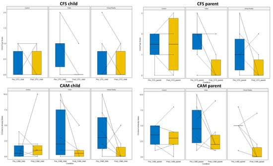 Regarding state anxiety, scores before the refill ranged from 0 to 10, as were scores after the refill. As observed with CFS, scores before the refill revealed a high variability between the conditions (Figure 3). For two children, state anxiety increased after the refill during the control condition, as was the case for one child in the VR condition. For parents, state anxiety ranged from 1 to 10 before the refill and from 0 to 9 after the refill. Scores increased for two parents in the control and video condition and for one parent in the VR condition. Based on visual inspection of the plots, for parents the VR condition seemed to result in lower state anxiety, while for children the video condition also seemed to be a suitable option to reduce state anxiety.
