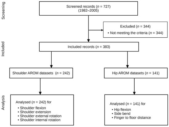 This secondary analysis of the study data from James et al. [] aimed to provide comprehensive information on the impact of SI on patients’ shoulder and hip AROM. This retrospective study, along with the work of James et al. [], was the first to examine SI in 727 subjects in the specific health care setting of a private practice over a representative 23-year period.