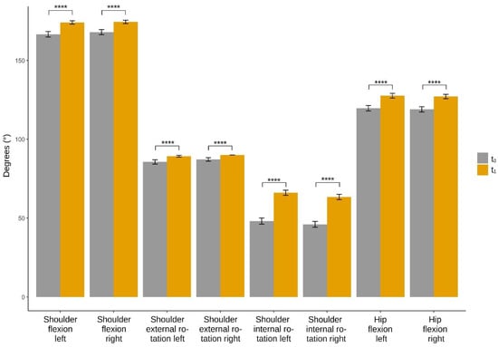 Changes before and after Rolfing Structural Integration treatment. t0, baseline measurement; t1, measurement after treatment. The error bars show the 95% confidence interval. Significant at the level **** <0.0001.