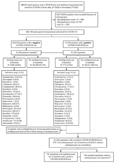 Study cohort. α Matched for age, sex, hospital, period of hospitalization, and number of medical conditions. β Matched for age, sex, hospital, period of hospitalization, number of medical conditions, any current diagnosis of psychiatric disorders, use of other psychotropic medications (benzodiazepines or Z-drugs, antipsychotic medications, mood stabilizers) or any medication prescribed according to compassionate use or as part of a clinical trial, and clinical and biological markers of COVID-19 severity.