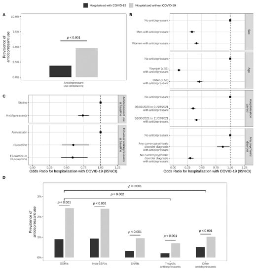 Prevalence of antidepressant use in inpatients hospitalized with and without COVID-19 (N = 82,586). (A) prevalence of antidepressant use in a matched analytic sample of inpatients with and without COVID-19, based on age, sex, hospital, period of hospitalization, and number of medical conditions; (B) association between antidepressant use and SARS-CoV-2 infection in a matched analytic sample of inpatients with and without COVID-19, stratified by age, sex, period of hospitalization, and any current diagnosis of psychiatric disorder; (C) comparison of antidepressant use with statin use, and fluoxetine or fluvoxamine use with atorvastatin use, in a matched analytic sample of inpatients with and without COVID-19; (D) associations across antidepressant classes.