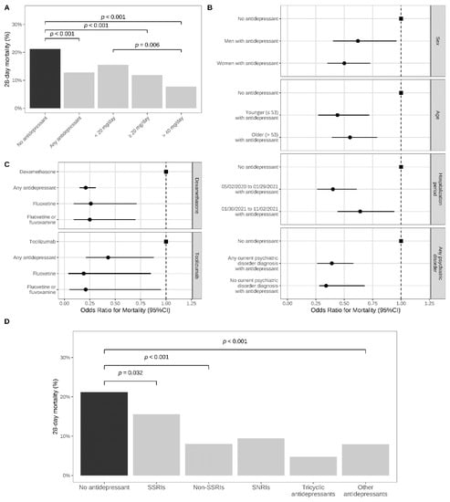 Antidepressant use and 28-day all-cause mortality in a matched analytic sample of patients hospitalized with COVID-19 (N = 1482). (A) Mortality rates in COVID-19 inpatients with and without an antidepressant at baseline in a matched analytic sample based on age, sex, hospital, period of hospitalization, number of medical conditions, any current diagnosis of psychiatric disorders, use of other psychotropic medications (benzodiazepines or Z-drugs, antipsychotic medications, mood stabilizers) or any medication prescribed according to compassionate use or as part of a clinical trial, and clinical and biological markers of COVID-19 severity; (B) associations between antidepressant use at baseline and 28-day mortality, stratified by age, sex, and period of hospitalization; (C) comparison of baseline use of antidepressants, fluoxetine, and fluoxetine or fluvoxamine with baseline use of dexamethasone and tocilizumab; (D) associations across antidepressant classes; abbreviations: ns, not significant.