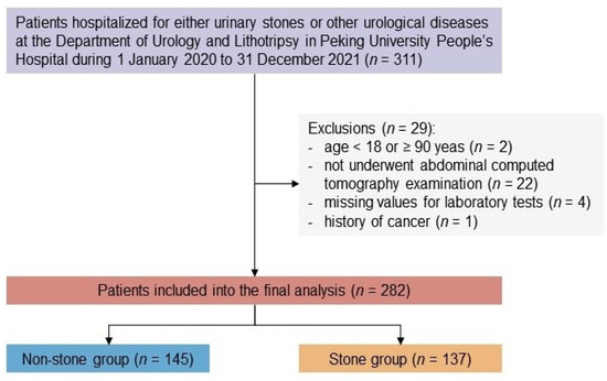 | Characteristics | Overall (n = 282) | Non-Stone Group (n = 145) | Stone Group (n = 137) | p-Value |
