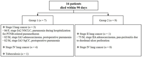 Sixteen patients died within 90 days after PTNB, as shown in Figure 1. Of them, seven were in Group 1, including three with stage I, three with stage IV lung cancer, and one with tuberculosis. Pneumonia was the cause of death in three patients with stage I lung cancer, and all three patients had comorbid diseases, including emphysema and idiopathic pulmonary fibrosis (IPF). Nine patients were in Group 2, including one with stage II, five with stage IVA, and three with stage IVB lung cancer. Pan-peritonitis and multiorgan failure were the causes of death in patients with stage II lung cancer.