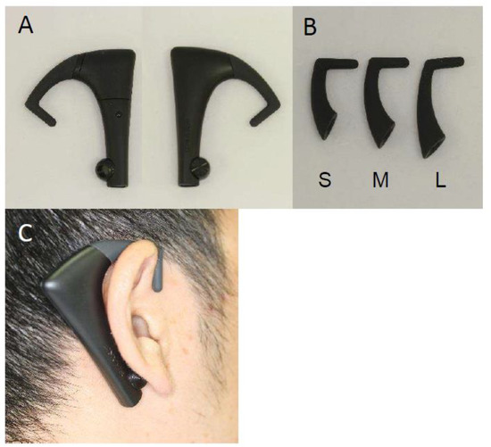 A wearable device for counting the number of chews (bitescan®). (A) Main unit; (B) ear-hooks for size adjustment; (C) bitescan® when worn.
